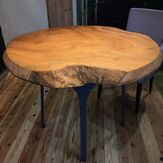 楠の一枚板から住宅のための円形のダイニングテーブルと、端材は捨てずスモールテーブルをデザイン。インテリアに呼応した「アーチ」をモチーフにスチールの脚で引き締めつつ、無垢の楠の質感と形状を活かしたものとしました。